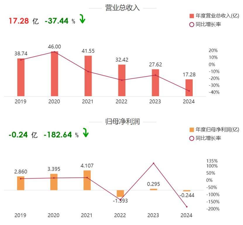 据公司2024年年报数据,全年实现营业收入17.28亿元,同比大幅下滑37.44%,营收规模较2020年巅峰时期的46亿元已出现大幅缩水,创下近五年新低。