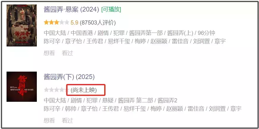 实际上,《酱园弄》之所以口碑票房双扑街,多多少少和分上下两部上映有关。